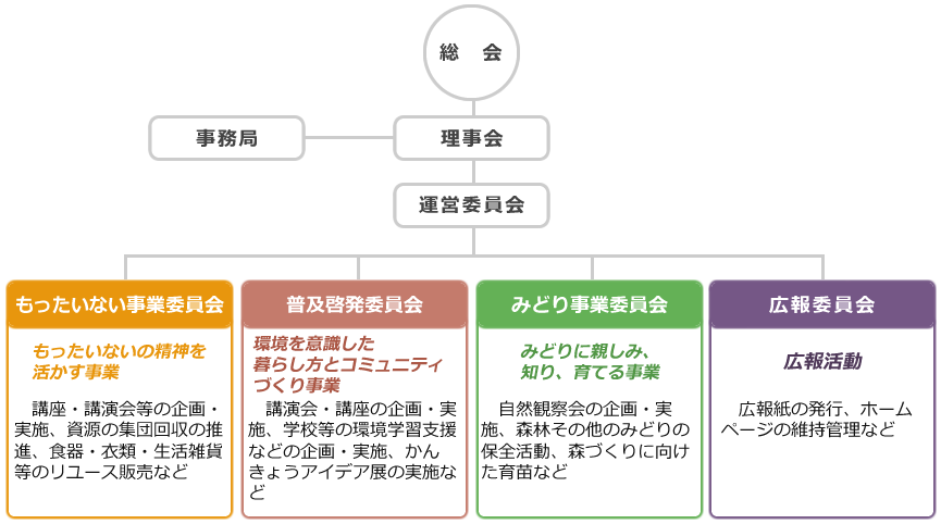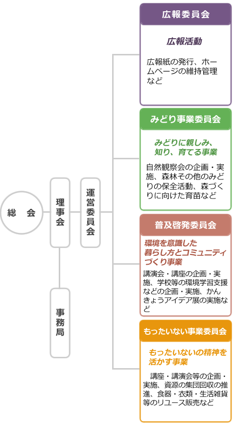 当法人の組織は、会員による総会、理事会、運営委員会と4つの事業委員会で運営されています。