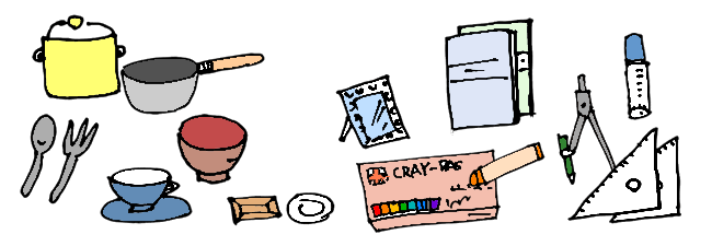 食器類・生活雑貨を展示販売しています。どなたでもご購入いただけます。[例]小皿、コーヒーカップ、お椀、スプーン・フォークなど、その他、 文具、額、学用品等を販売しています。